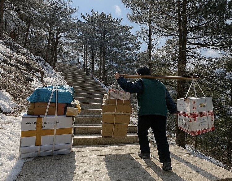 从光明顶下来,在通往白鹅岭的石道上,突然前面的游人都往左靠,让道给几位挑著沉沉担子的山民。他们肩挑着沉重货担,艰难登阶,是为山上饭店供应食材。看着他们瘦小的背影,我和同行的先生说:希望我们下次再来黄山时,机器人已经替代了山民挑夫的劳作。山民来管理机器人就好了。我先生说,那感情好啊!