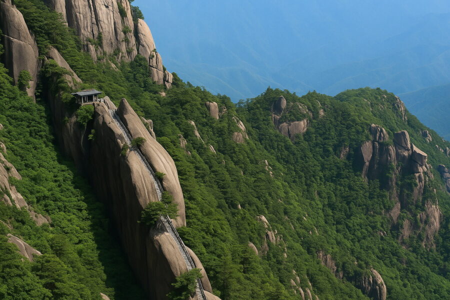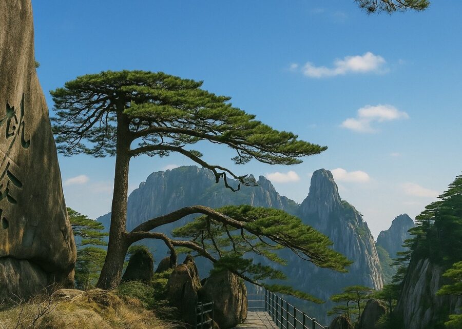 从汤口出发,经慈光阁转乘玉屏索道登高。我在缆车中望向崖壁,那壁立千仞、怪石嶙峋、松枝劲长的画面,在雾霭间展开,仿佛走入一幅宏大的黄山画卷。下缆车后,先经“象鼻石”,再走过坡陡的“好汉坡”。尽管气喘吁吁,我仍一步步向上攀登,只为见那心中的“迎客松”。这棵松立于玉屏楼下的巨石旁,海拔1680米,从青狮石上破石而出,傲然挺立在悬崖峭壁上,树姿苍劲挺拔,已在风霜雨雪中屹立千年。我默默仰望,沉思良久。“迎客松”不仅是中华民族热情好客的象征,更是中华民族坚韧不拔的精神写照!